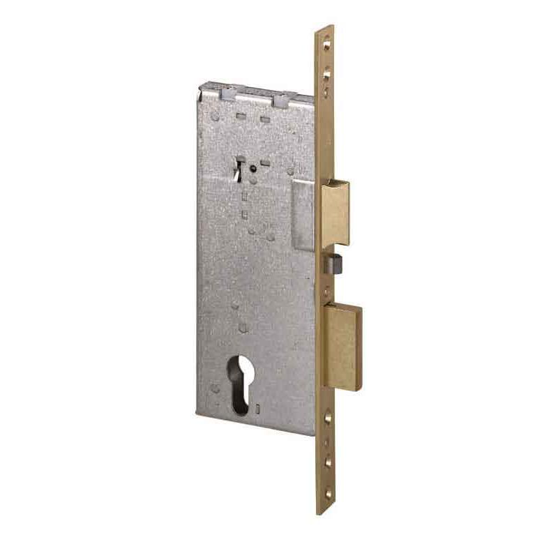 scatola in acciaio con rivestimento zincato - frontale e contropiastra in ottone satinato - scrocco reversibile elettrificato - viti di fissaggio serratura incluse