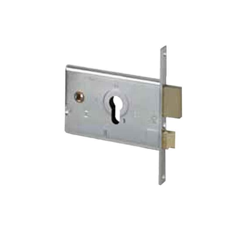 finitura scatola e frontale zincata - scrocco, rullo e catenaccio in ottone - con catenaccio e scrocco reversibile - vite di fissaggio cilindro inclusa