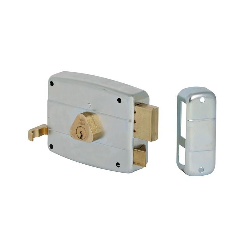 finitura in acciaio zincato - scrocco e catenaccio in ottone - tirante e pomolo in ottone - 3 chiavi a duplicazione libera incluse fissaggio con vite - senza aletta di fissaggio - tirante interno - 2 mandate