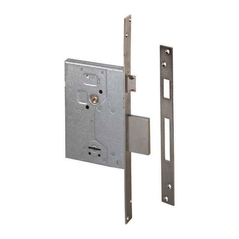 scatola in acciaio con rivestimento zincato - frontale e contropiastra in acciaio satinato nichelato - scrocco e catenaccio reversibili - 3 chiavi e viti di fissaggio incluse