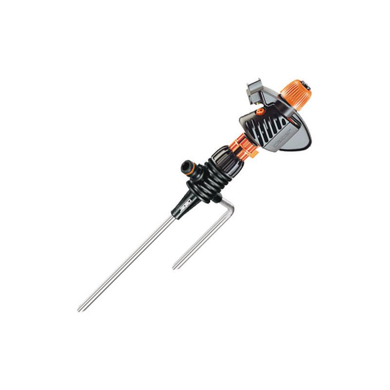 a battente per settori oppure a rotazione continua - montata su picchetto a doppio puntale - vite rompigetto - autoregolazione fino a 4 bar - perno in INOX e boccola in bronzo - dispositivo di regolazione per alte pressioni