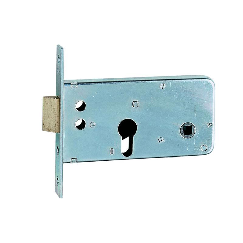 per serramenti in alluminio - cassa e frontale in acciaio zincato - catenaccio ad 1 mandata con scrocco reversibile incorporato - scrocco comandato da chiave o maniglia - quadro maniglia 8mm - vite fissaggio cilindro