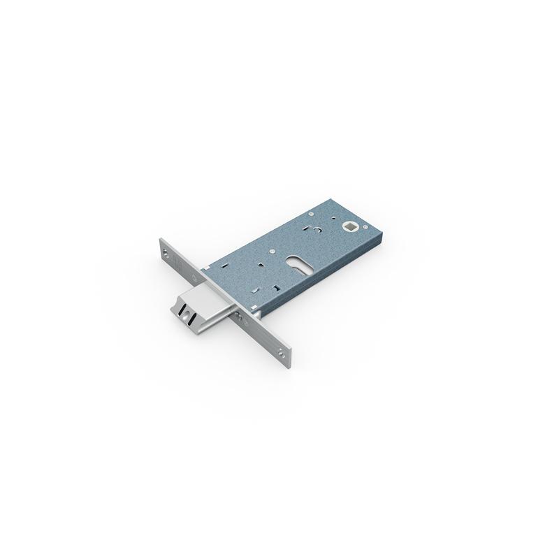 cassa in acciaio zincato e plastificato - frontale e molle in INOX - scrocco antirumore reversibile a 2 mandate e intercambiabile con rullo - scrocco comandato da chiave o maniglia - quadro maniglia 8mm