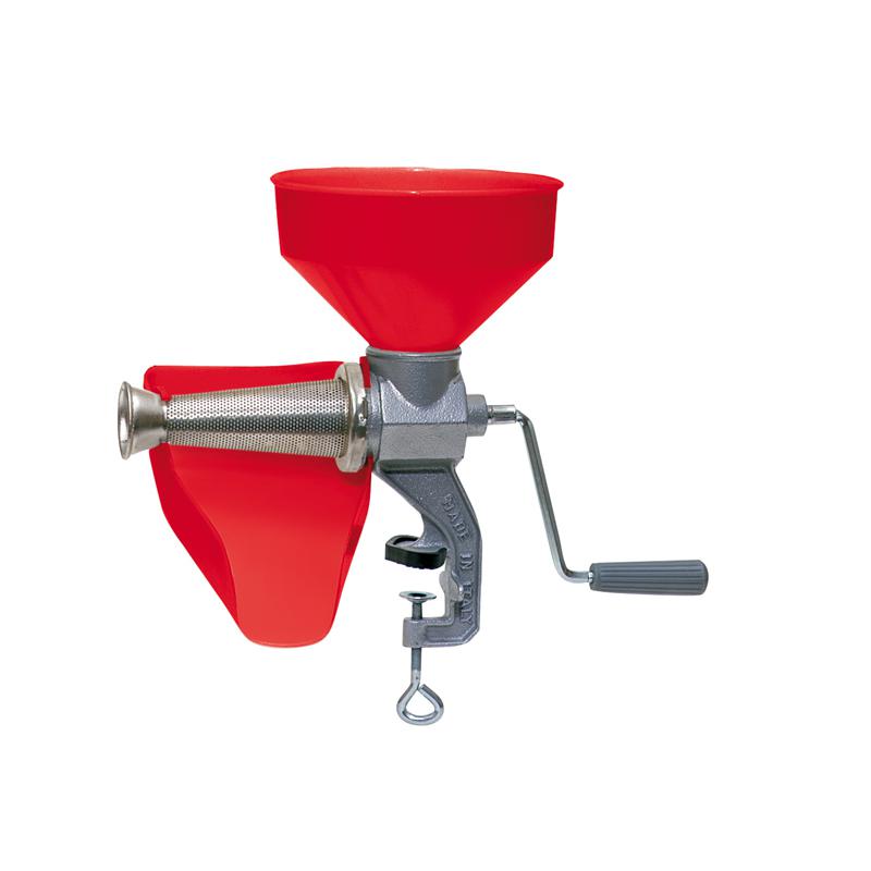 cono filtro in acciaio - corpo in ghisa - elica passapomodoro in resina acetalica - morsetto di fissaggio a tavolo con protezione in gomma - adatto per l'utilizzo con pomodoro cotto o crudo e per la produzione di succhi di frutta